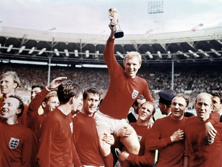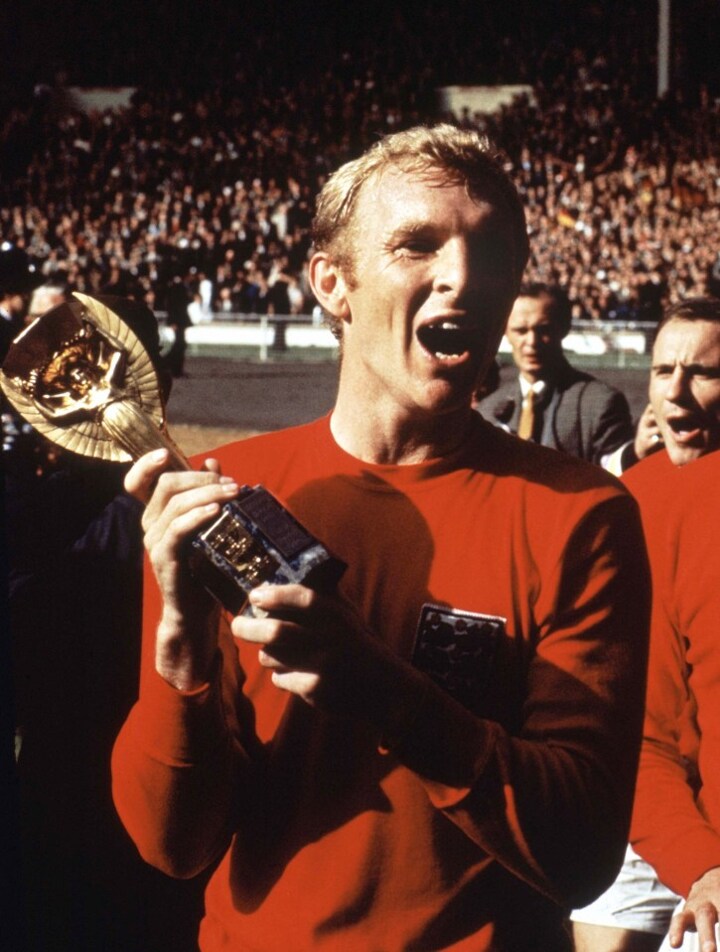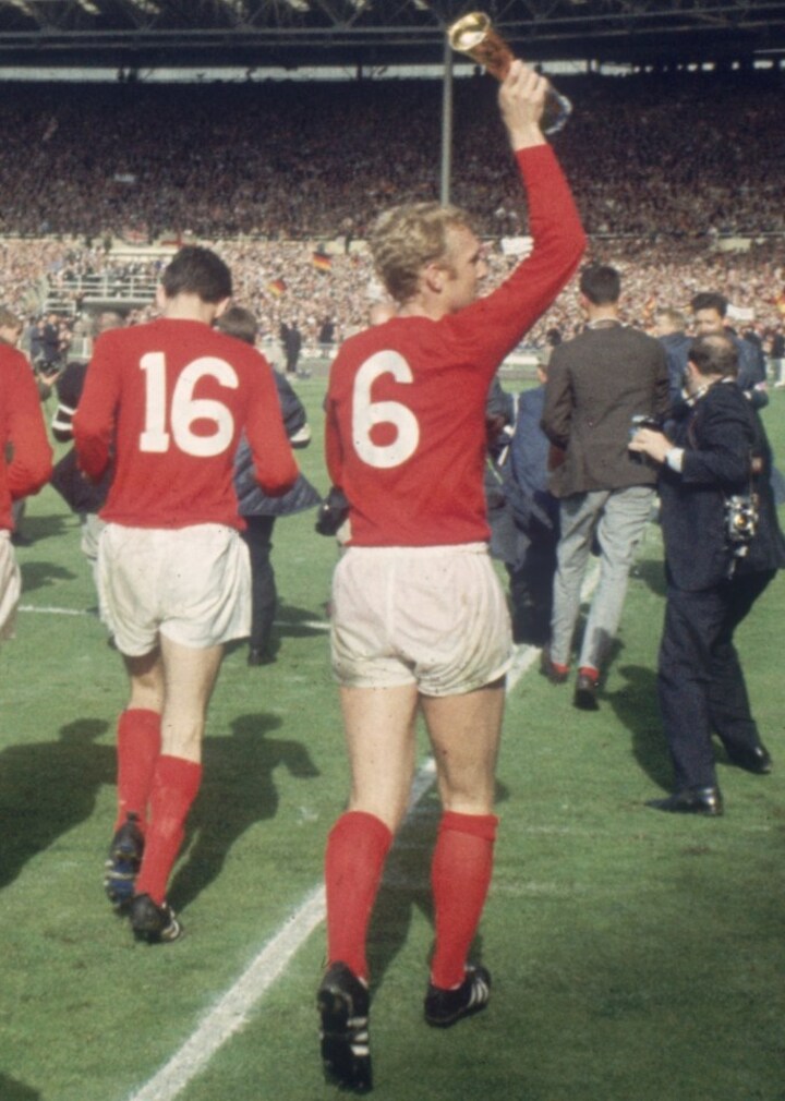 Skipper Bobby wore the red No6 top as he lifted the Jules Rimet Trophy at Wembley.