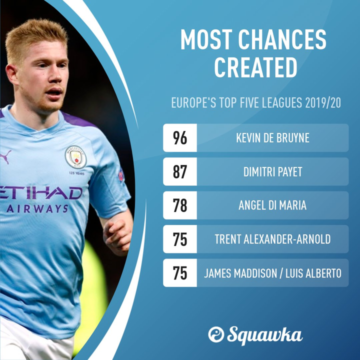 De Bruyne created 96 chances this season, and he ranked the first in the list of most chances created>> Copyright Declaration