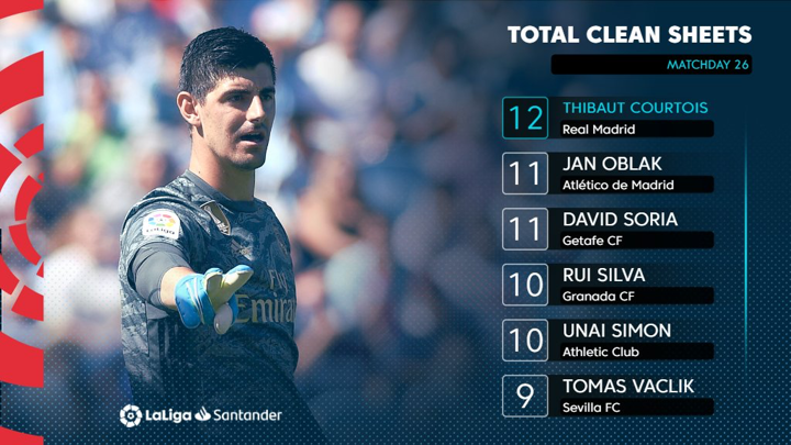 Thibaut Courtois is currently the goalkeeper with most clean sheets in 2019/20 La Liga season.
