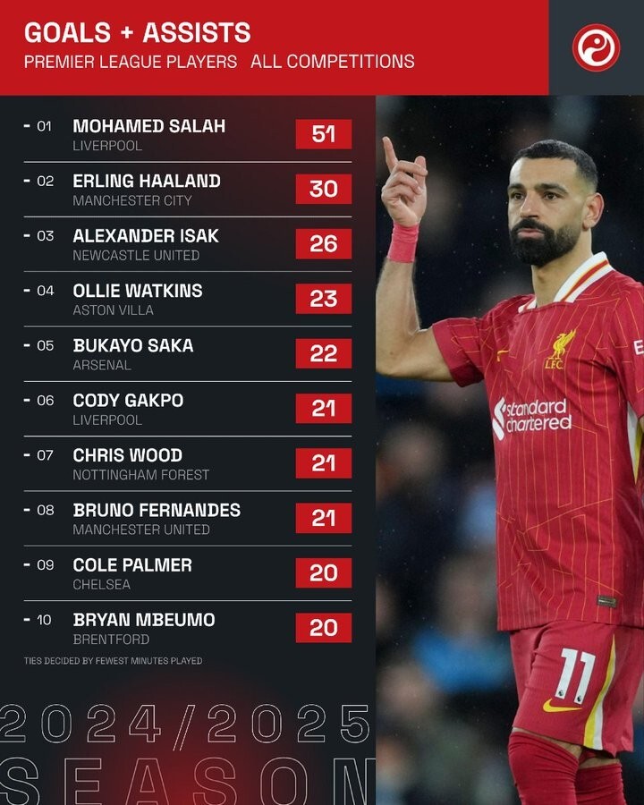 Most goals + assists by EPL players across all competitions this season: Salah leads,Haaland and Isak in. Copyright Declaration