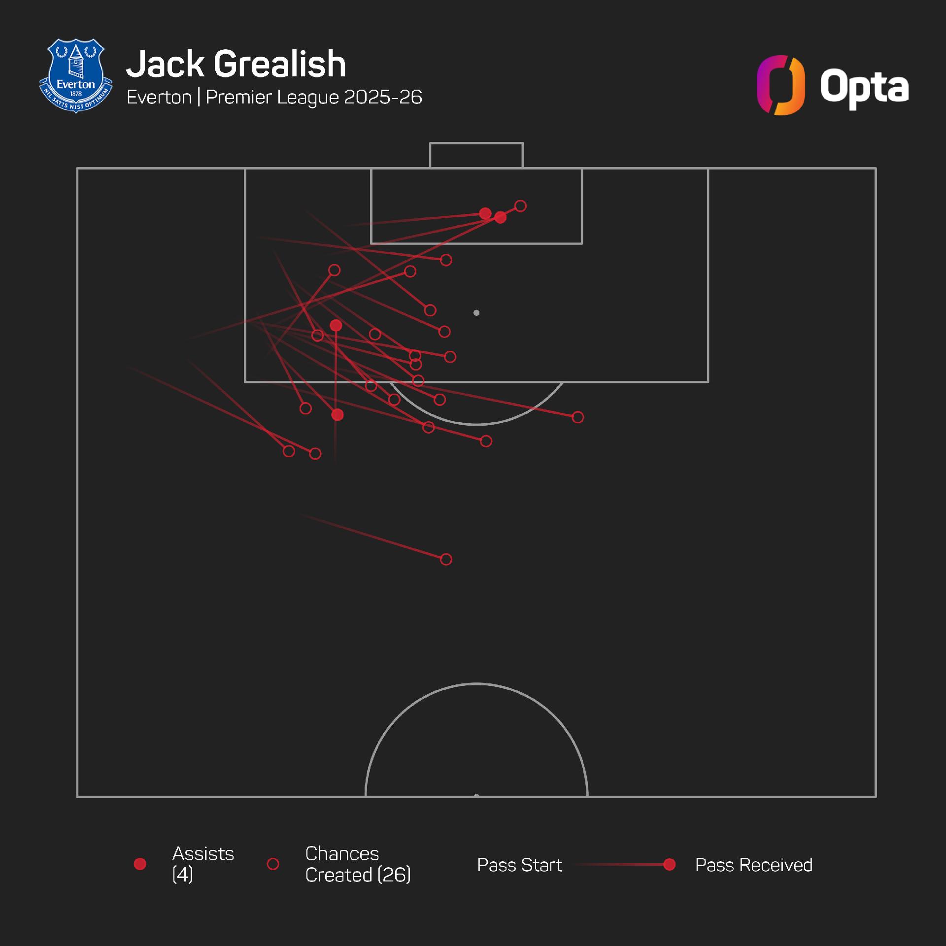 The playmaker has created 26 chances, with 25 of those coming from open play – a tally only bettered by Jeremy Doku (31). Grealish's 3.0 expected assists (xA) ranks behind only Doku (3.5).