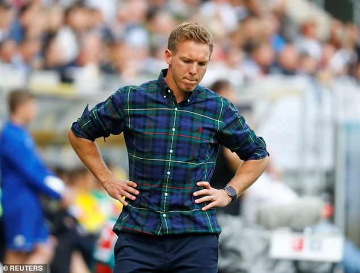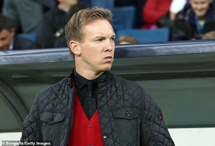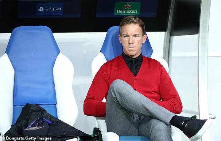 Nagelsmann, 31, was pictured sporting a fitted cherry red cardigan over the top of a black shirt and black tie. The grey trousers and white soled trainers completed a unique - if uncoordinated - outfit of the day.
