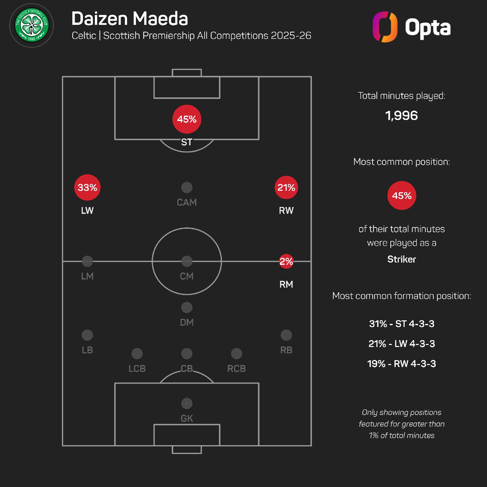 Nancy believes Maeda's versatility can be a major asset for Celtic – this season, he has played 45% of his minutes as a central striker, 33% on the left and 23% on the right.