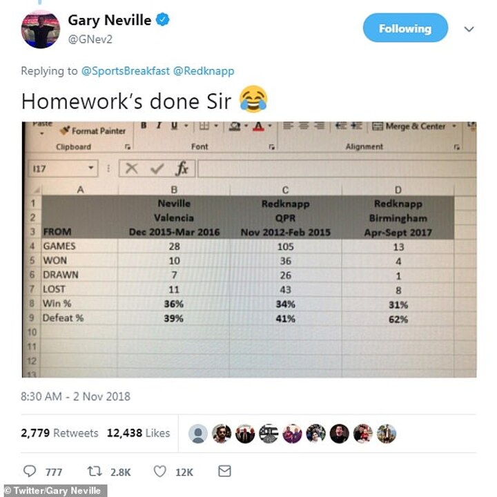 Now Neville has responded, posting a screengrab of a spreadsheet in which he compares his record during four months in charge at Valencia in 2015 and 2016 with Redknapp's stats for two of his clubs.