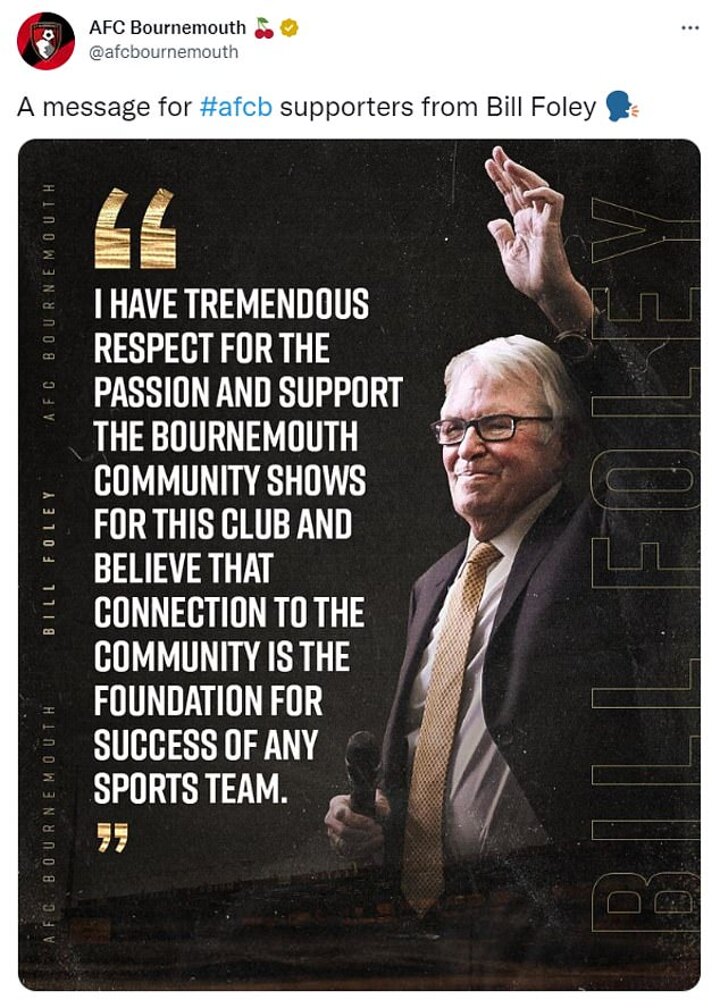 Foley takes Bournemouth on from Swiss-based Russian businessman Maxim Demin, who owned the club for 11 years.