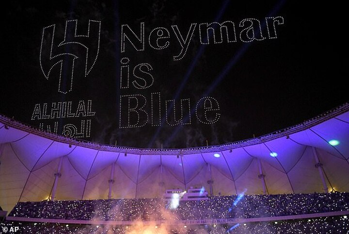 The former PSG man was treated to a princely salutation replete with fireworks, bright lights, high-fives from a guard of honour and a drone display in the sky which read 'Neymar is Blue' in reference to the club's colours. Fellow signings Malcom and Yassine Bounou were also revealed to fans.