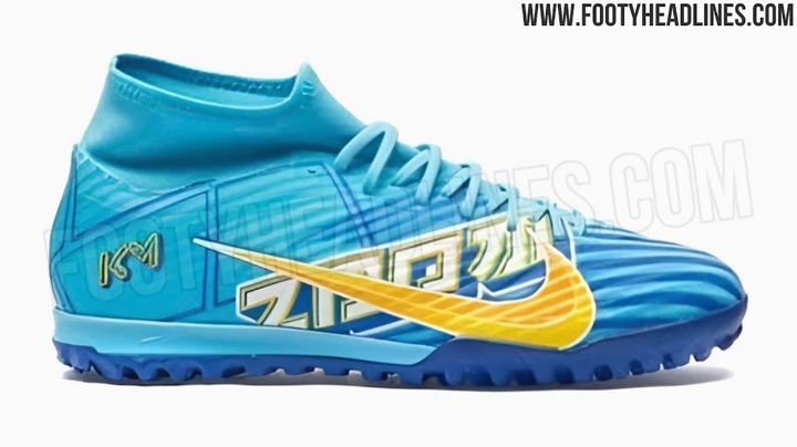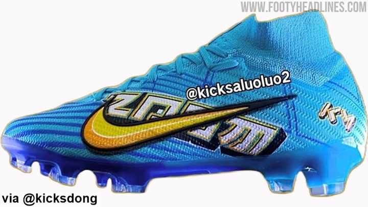 The baltic blue/sundial/white Nike Zoom Mercurial cleats from the new 'Kylian Mbappé 2023-24' collection are identical to the launch edition looking at features.
