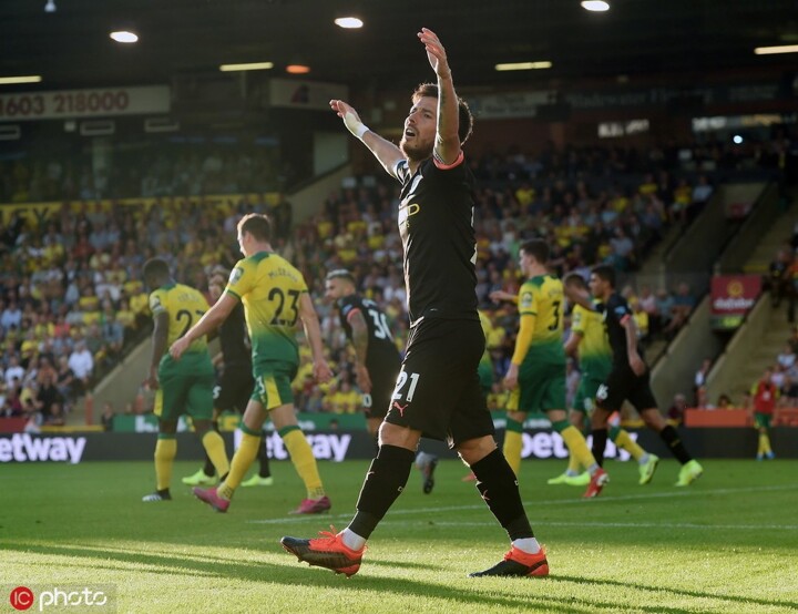 A minute after Stones dallied on the ball and was almost punished, Otamendi does the same thing. Buendia puts the pressure on and wins the challenge in the box. He squares to Pukki, who controls before stabbing an effort past Ederson.