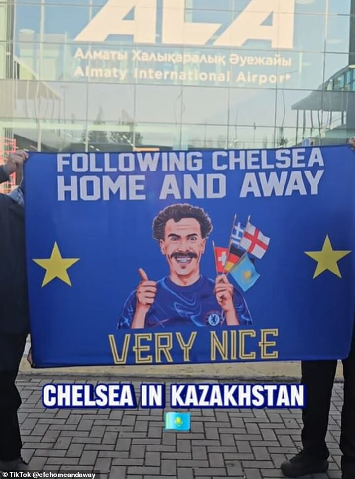 Police in Kazakhstan did not see the funny side as Chelsea fans attempted to enter the Almaty Ortalyq Stadium with a Borat inspired flag on Thursday.
