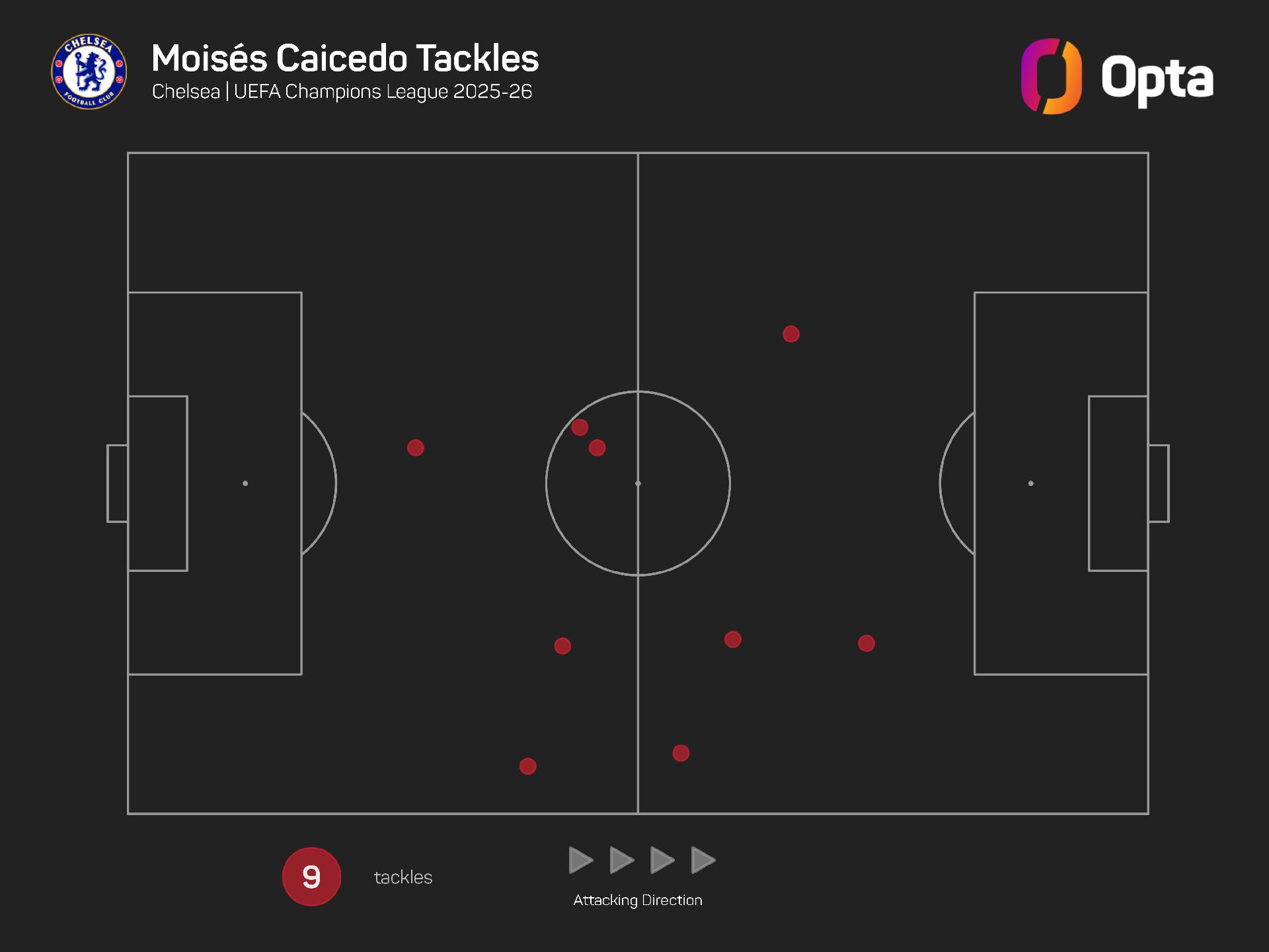 Only two players – Eintracht Frankfurt's Nathaniel Brown (11) and Copenhagen's Lukas Lerager (10) – have made more tackles in this season's Champions League than Caicedo (nine).