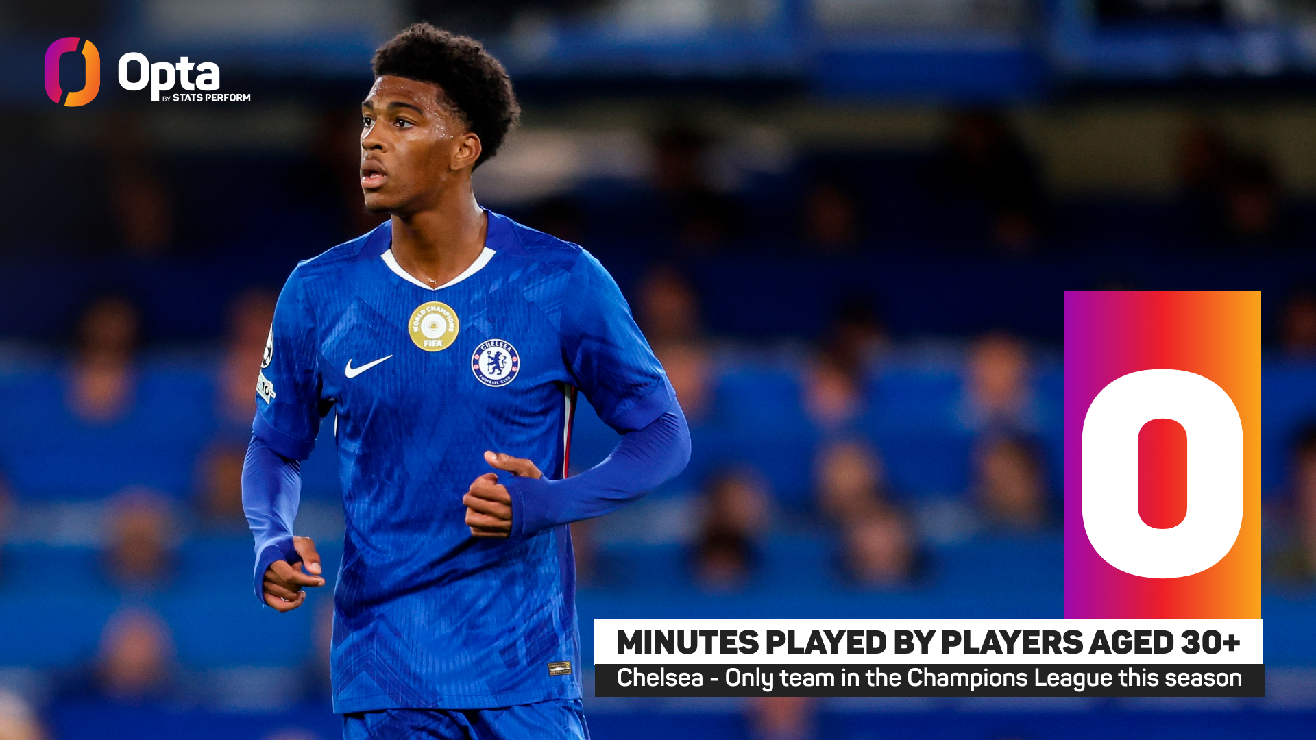 Twenty-eight-year-old Tosin Adarabioyo is the oldest player to be registered in Chelsea's Champions League squad, so they are set to become just the third English team to go three or more games in the competition without giving a single minute to a player in their 30s, after Liverpool in 2002-03 and Tottenham in 2016-17 (both six games in a row).