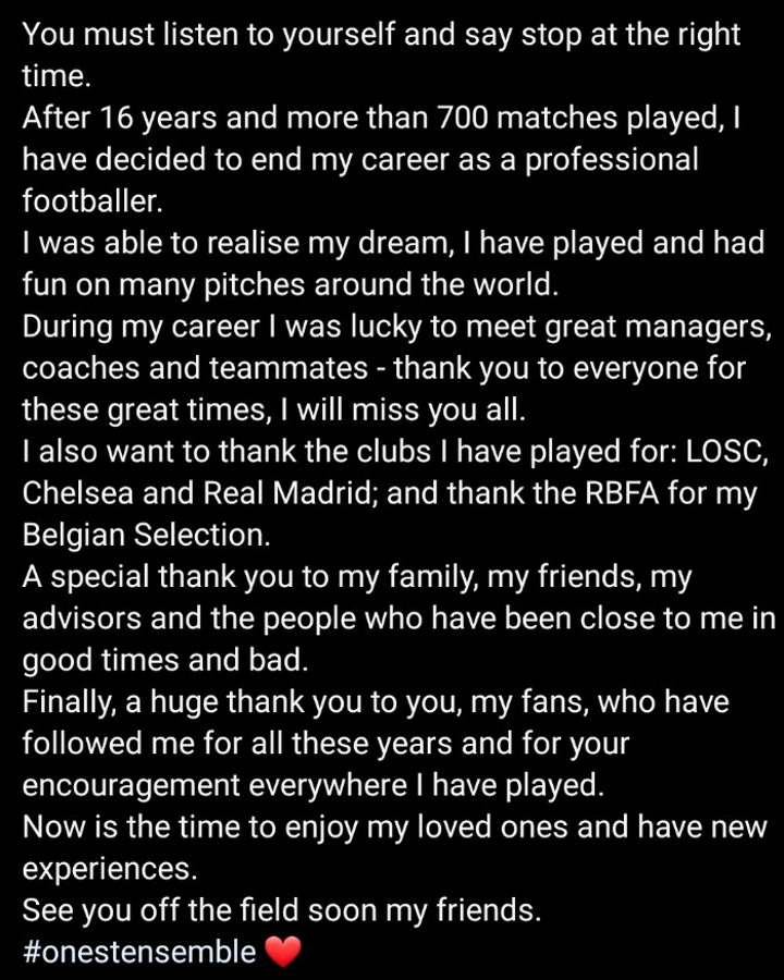 The former Chelsea, Real Madrid and Lille forward, who won 126 caps for Belgium, has called time on his career at the age of 32.