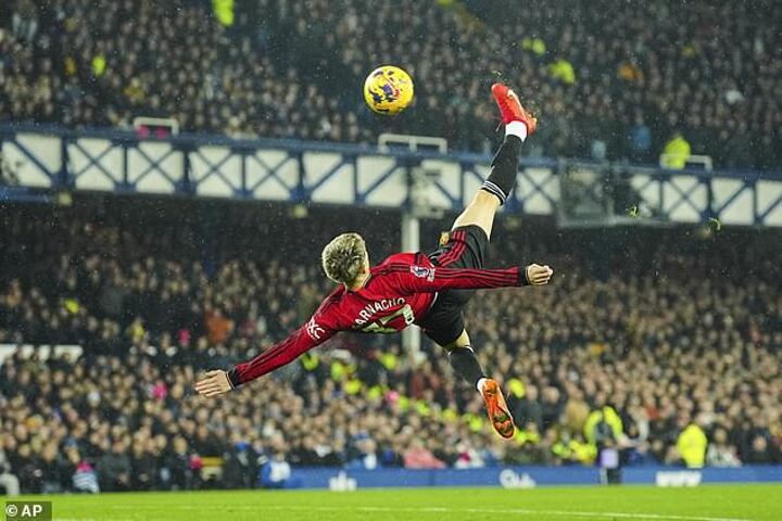Garnacho drew gasps inside Everton’s Goodison Park stadium when he opened the scoring for Manchester United in astonishing style in this Premier League showdown. Diogo Dalot’s lofted cross was slightly behind the Argentinian, but he launched himself into mid-air and sent a stunning overhead kick rocketing into Jordan Pickford’s goal.