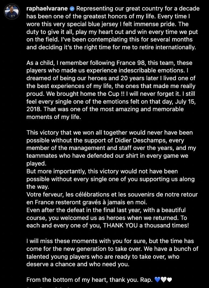 In a long message posted on his Instagram account, Varane states that representing France for a decade had been one of the biggest honours of his life. He writes that he had been thinking about international retirement for some months and decided that now was the right time to hang up his France boots. He continues by recalling that, as a kid watching the 1998 World Cup, he dreamt of emulating his childhood heroes – a feat he achieved by winning, twenty years later, the 2018 World Cup in Russia, one of the greatest and most memorable moments of his life.