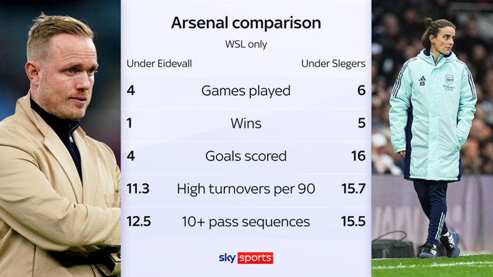 "You can see the team growing," Slegers told Sky Sports in December. "The players want to play a type of football, the Arsenal way. It's integrated into the club and it's what we strive for, as many minutes on the pitch as possible."