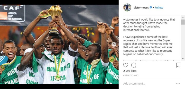 "I would like to announce that after much thought I have made the decision to retire from playing international football," writes Moses through his Instagram account.