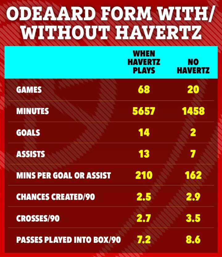 Since the start of last season, when playing with Havertz up top, Odegaard has 14 goals and 13 assists, and per 90 minutes on average creates 2.5 chances, produces 2.7 crosses and plays 7.2 passes into the box.