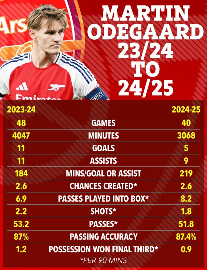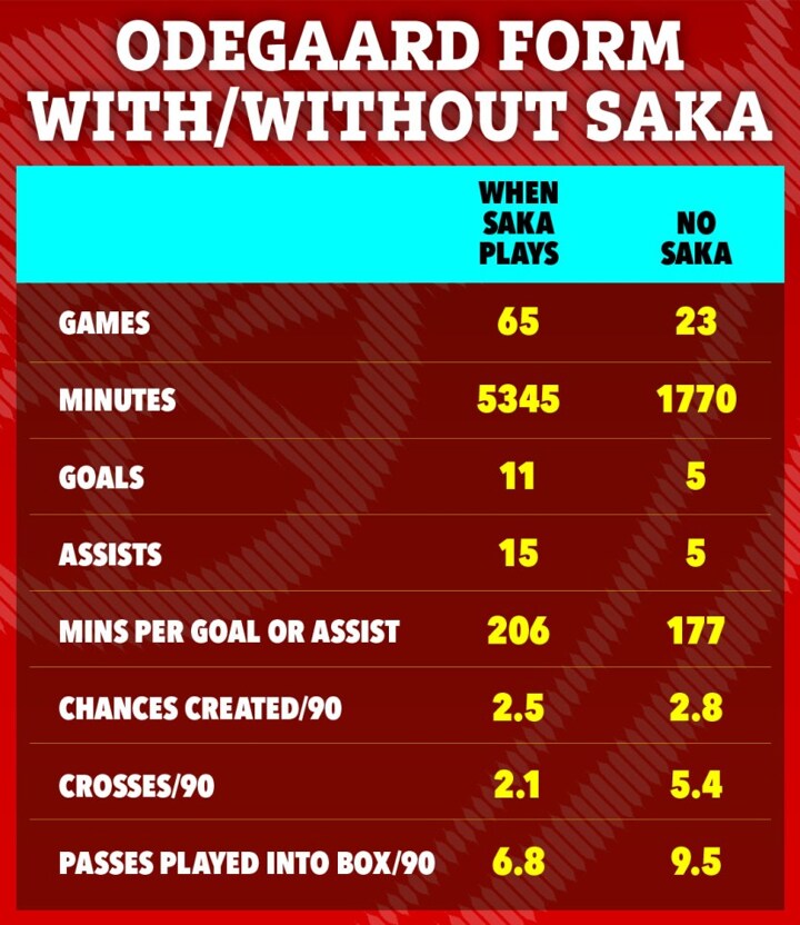 It is the same story with Saka. With the England winger on the pitch since 2023/24, Odegaard has scored 11 goals with 15 assists, and averages per 90 minutes 2.5 chances created, 2.1 crosses and 6.8 passes into the box.