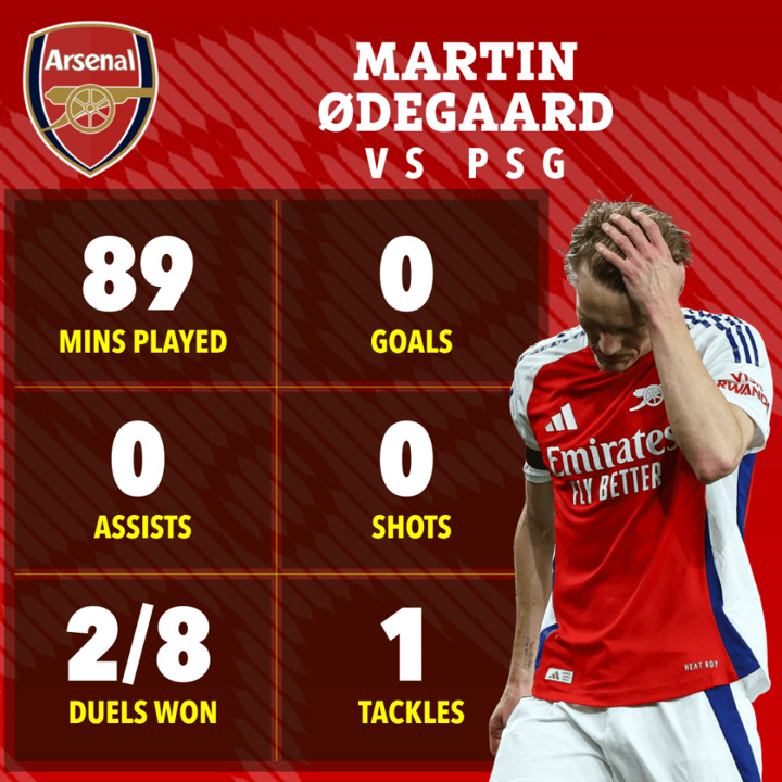 In second half injury time, losing 1-0 to Paris Saint-Germain in last night’s Champions League semi-final first leg, Odegaard was subbed off by Mikel Arteta for 18-year-old Ethan Nwaneri, having completed just 20 of 23 attempted passes and created one chance.