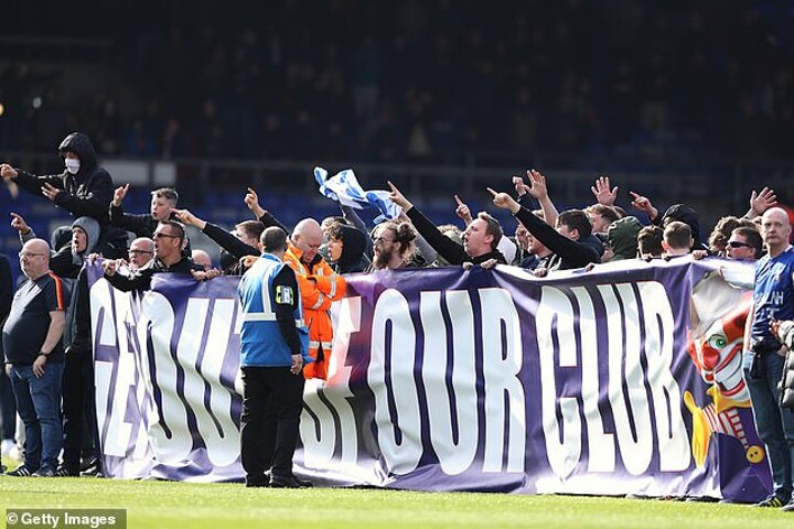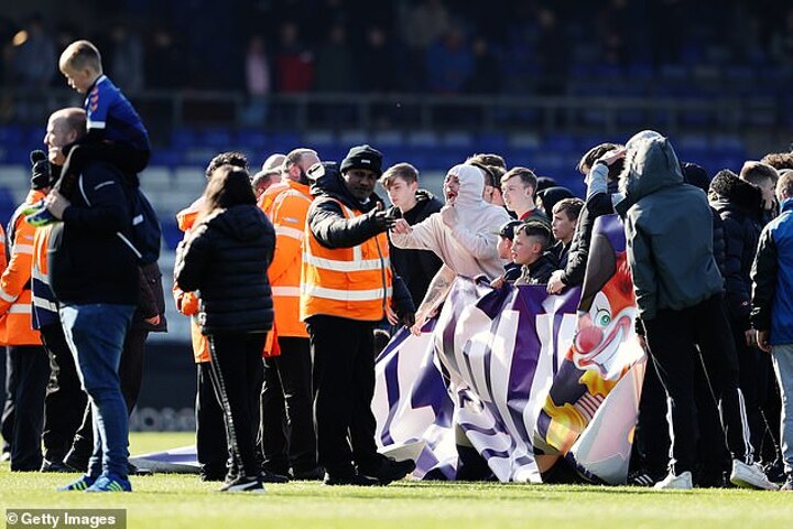 Ten minutes before the end, fans left angry by the actions of Abdallah Lemsagam since he took over the club in 2018 stormed onto the playing area and unfurled a banner in the centre circle reading 'GET OUT OF OUR CLUB'.