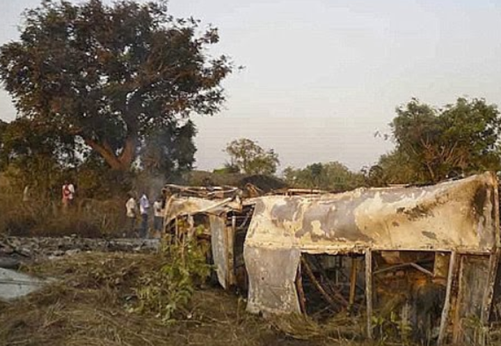 The team were travelling north from Lomé for a league match against Sokodé Semassi when one of their tires burst, sending the bus off the road and down into a ravine near the city of Atakpame. According to witnesses, the bus (pictured) rolled several time and burst into flame.