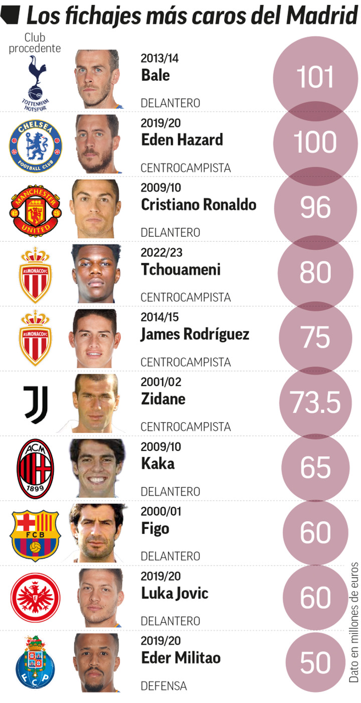 Only three players have been more expensive for Real Madrid: Gareth Bale (Tottenham, 2013), Eden Hazard (Chelsea, 2019) and Cristiano Ronaldo (Manchester United, 2009).