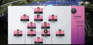 Inter Miami CF XI: Óscar Ustari, Suarez, Alba, Busquets, De Paul, Maximiliano Falcón, Telasco Segovia, Tadeo Allende, Ian Fray, Noah Allen, Yannick Bright