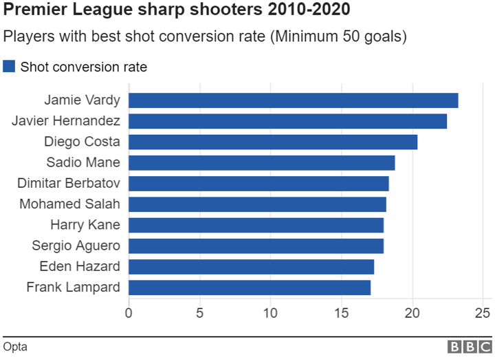 Vardy's nearest rivals, and the only two other players to have 50 goals to their name and a conversion rate above 20%? Aguero? Nope. Kane? Nah. Take a bow... Javier Hernandez and Diego Costa.