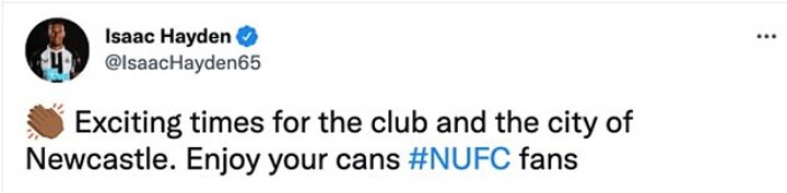Newcastle defender Isaac Hayden added: 'Exciting times for the club and the city of Newcastle. Enjoy your cans #NUFC fans'