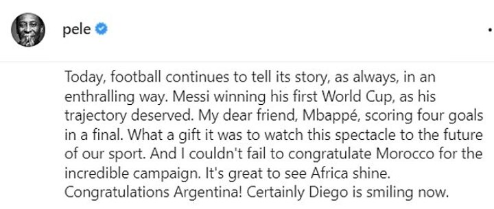 'Today, football continues to tell its story, as always, in an enthralling way. Messi winning his first World Cup, as his trajectory deserved,' Pele wrote on Instagram.
