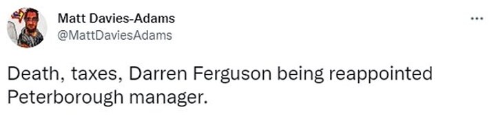 Football journalist Matt Davies-Adams said: 'Death, taxes, Darren Ferguson being reappointed Peterborough manager', before he added: 'Football is a simple game, twenty two men chase a ball for 90 minutes and at the end, Darragh MacAnthony appoints Darren Ferguson as Peterborough manager.'