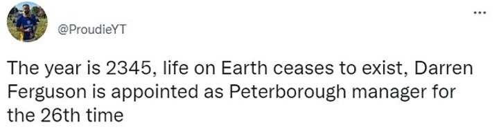 Another joked: 'The year is 2345, life on Earth ceases to exist, Darren Ferguson is appointed as Peterborough manager for the 26th time.'