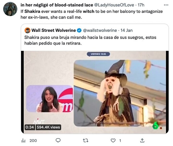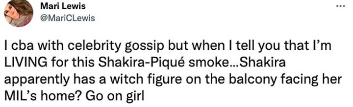Another joked: 'If Shakira ever wants a real-life witch to be on her balcony to antagonize her ex-in-laws, she can call me.'