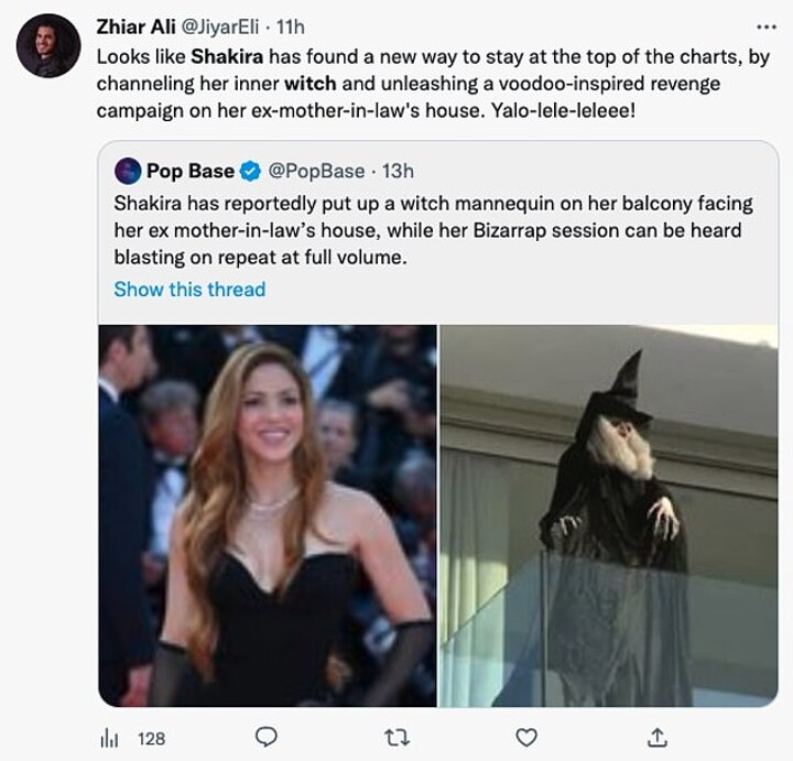 A different person said: 'Looks like Shakira has found a new way to stay at the top of the charts, by channelling her inner witch and unleashing a voodoo-inspired revenge campaign on her ex-mother-in-law's house. Yalo-lele-leleee!