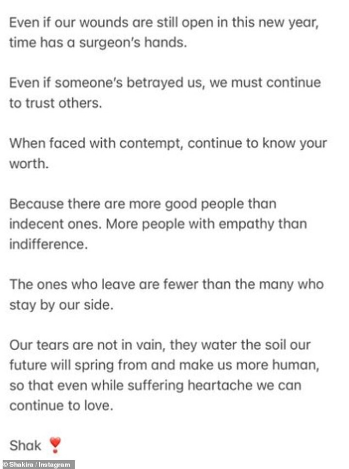 Shakira also took an apparent swipe at Gerard as she penned an Instagram post about healing after betrayal on New Year's Day.