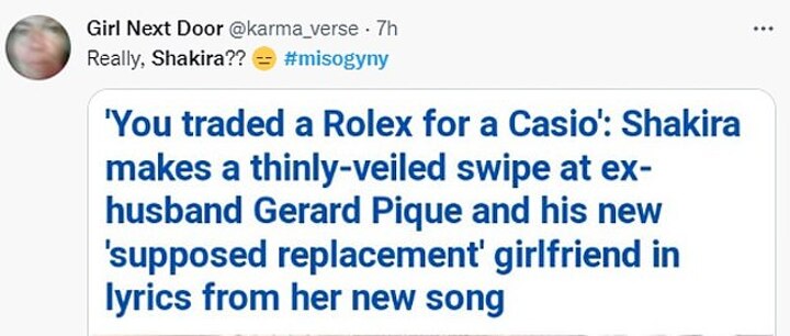 Someone else wrote: 'Shakira objectifies and objectifies herself by denigrating her ex's new partner under the phrase 'change a Rolex for a Casio'. We are humans not objects. There is nothing empowering in being mean to another woman. You have to know how to leave.'