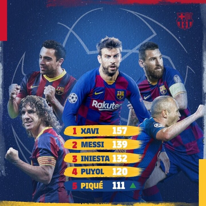 Pique moves into 5th on Barca's all-time UCL appearances list, Messi ranks 2nd