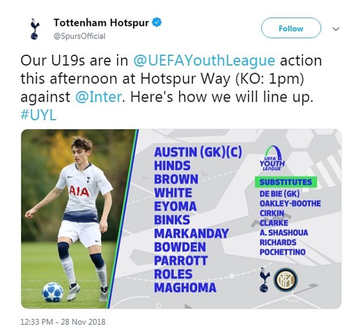 The 17-year-old is described as a 'wide player with an eye for goal' by Spurs' website and has featured four times in the U18 Premier League this campaign, scoring his first goal of the season in a clash with Norwich last month.
