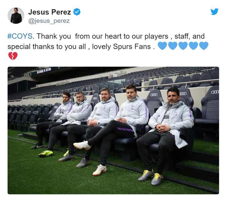 Tweeting a picture of himself, Pochettino and the rest of the coaching staff in the Tottenham Hotspur Stadium dugout, Perez wrote: "#COYS. Thank you from our heart to our players, staff, and special thanks to you all, lovely Spurs Fans ."
