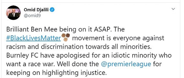 Comedian Omid Djalli said: 'Brilliant Ben Mee being on it ASAP. The Black Lives Matter movement is everyone against racism and discrimination towards all minorities.