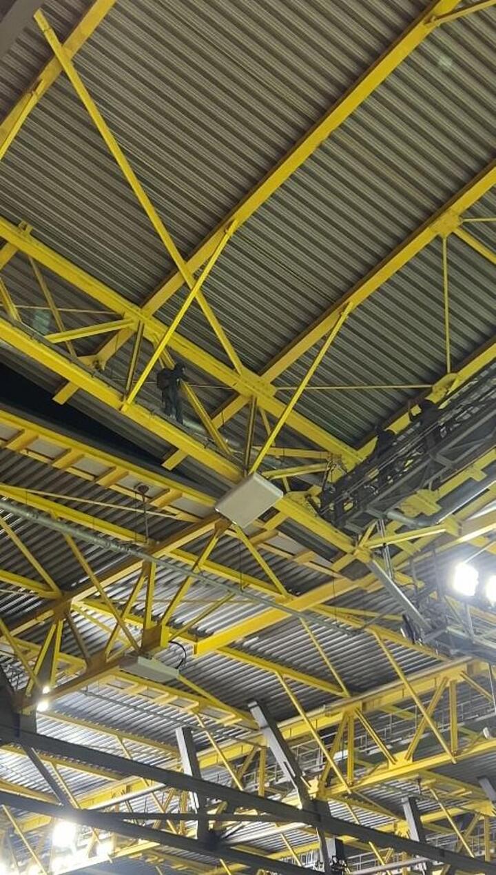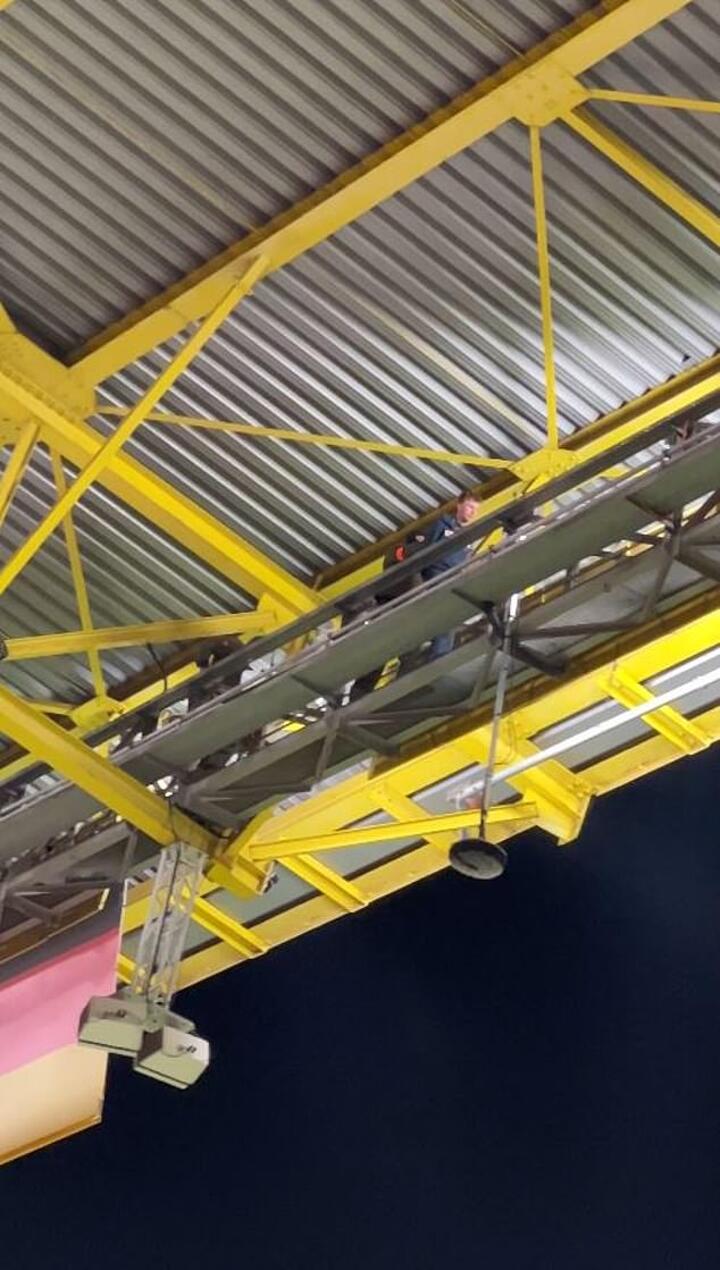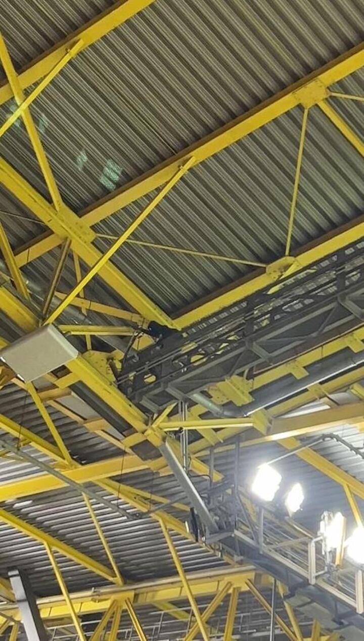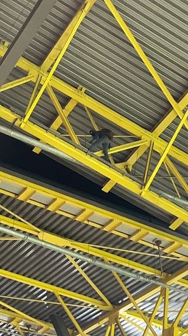 Footage originally captured by Mail Sport at the match showed the man walking along a beam high above those below in the stands, many of whom were shouting at him to come down.