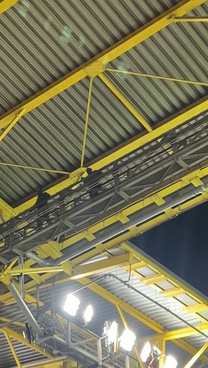 The man walked to the corner of the stadium's roof as police sought to catch up with him. The police drew their guns as they chased him down in the rafters, with the man eventually relenting at gunpoint.