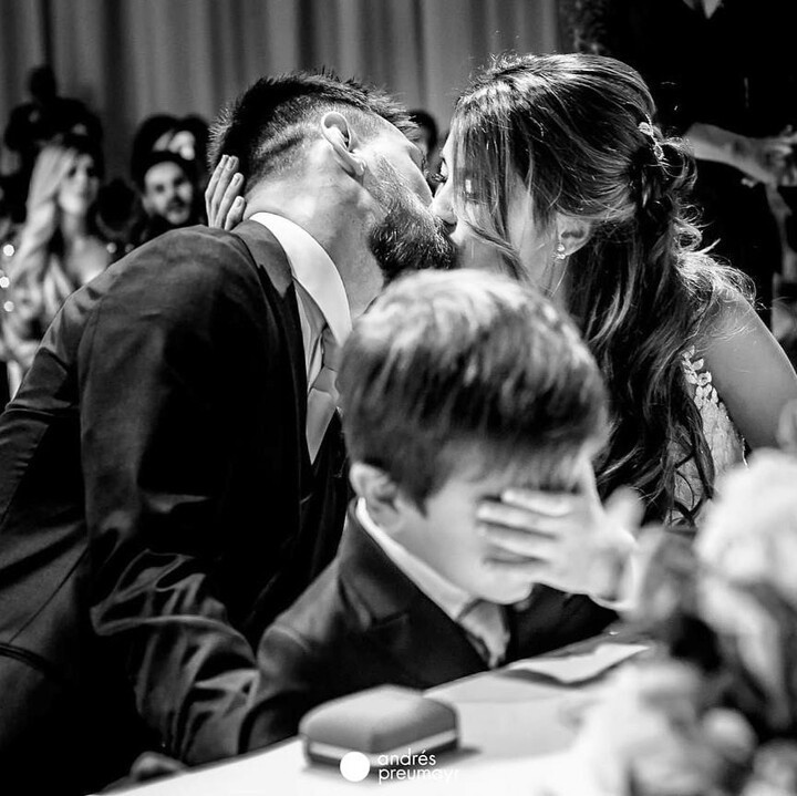 Antonela posts a special photo on Instagram to celebrate Valentine's Day, in which Messi and she were kissing while their handsome son Thiago was covering his face in hand.