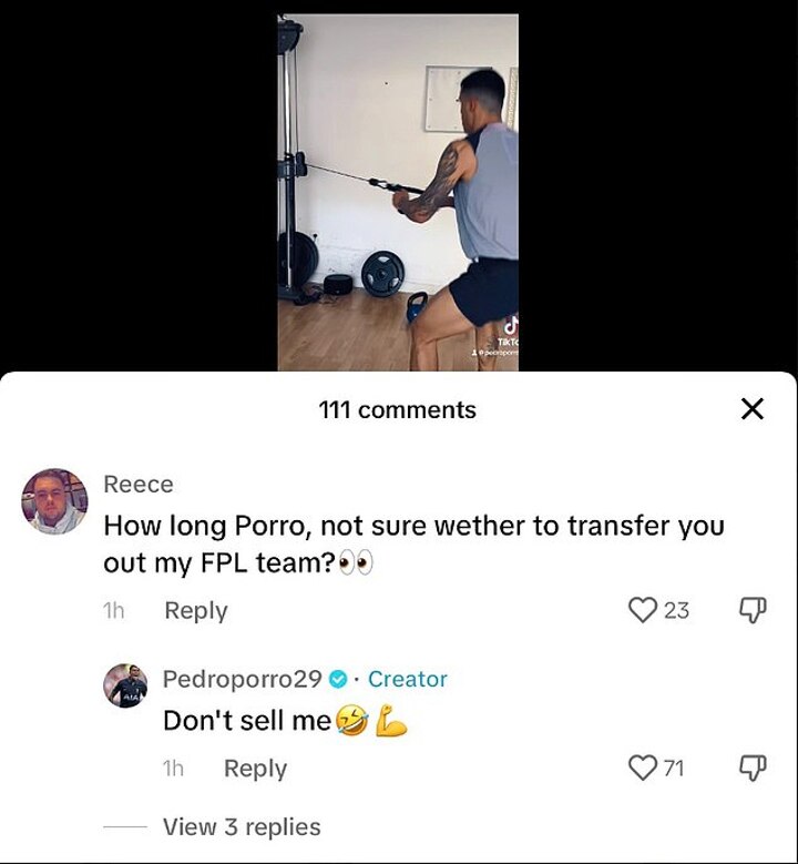 But it appears Porro could be back in action sooner than we thought after posting a video of himself completing a rigorous gym session on his Tik Tok. He captioned the video 'Back soon' and was also asked by a Fantasy Premier League fan how long he'd be out for.