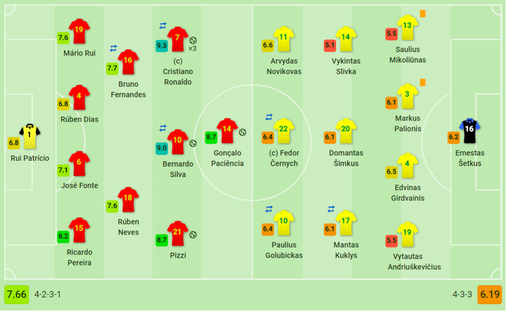 From the right side of the penalty area, Pizzi picks the ball up after a wonderful throughball from Fernandes. The midfielder opens up his body before seeing his shot from a tight angle deflect beyond Setkus. 3-0.
