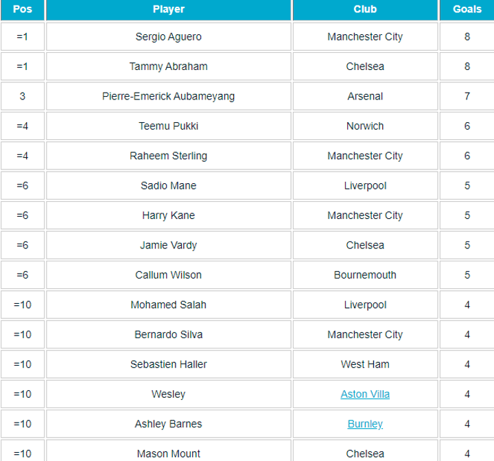 Goal rounds up the leading goal scorers, with Manchester City's Sergio Aguero and Chelsea's Tammy Abraham at the front of the pack