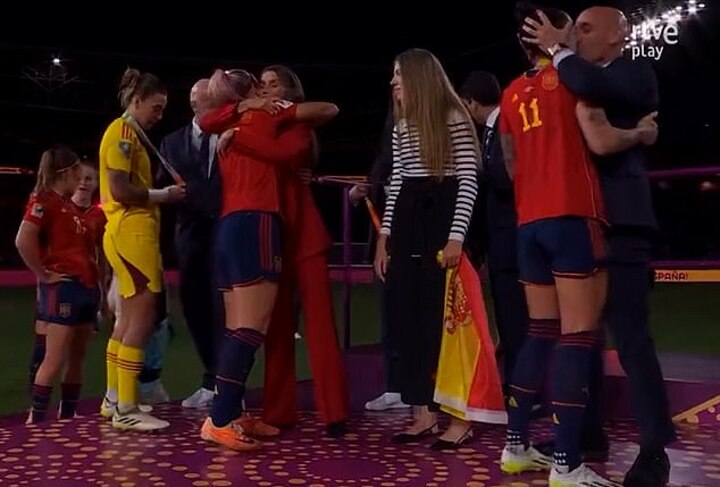 This is the moment the male president of Spain's FA grabs one of La Roja's World Cup-winning players and kisses her on the mouth.
