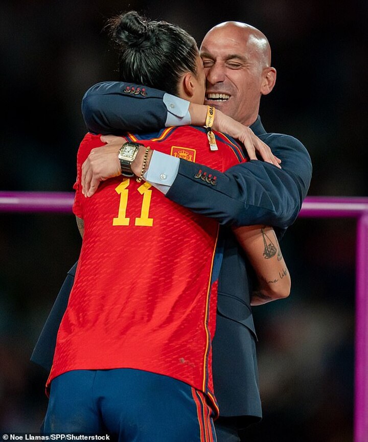 Also on the stage was Spanish Federation boss Luis Rubiales, who threw his arms around striker Jenni Hermoso, and gave her a strong hug while whispering in her ear.