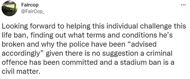 The account shared a photo of the letter sharing the banning order and said: 'Looking forward to helping this individual challenge this life ban, finding out what terms and conditions he's broken and why the police have been "advised accordingly" given there is no suggestion a criminal offence has been committed and a stadium ban is a civil matter.'