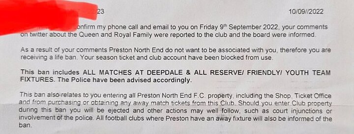 'This ban also relates to you entering all Preston North End F.C. property, including the Shop, Ticket Office and from purchasing or obtaining any away match tickets from the club.